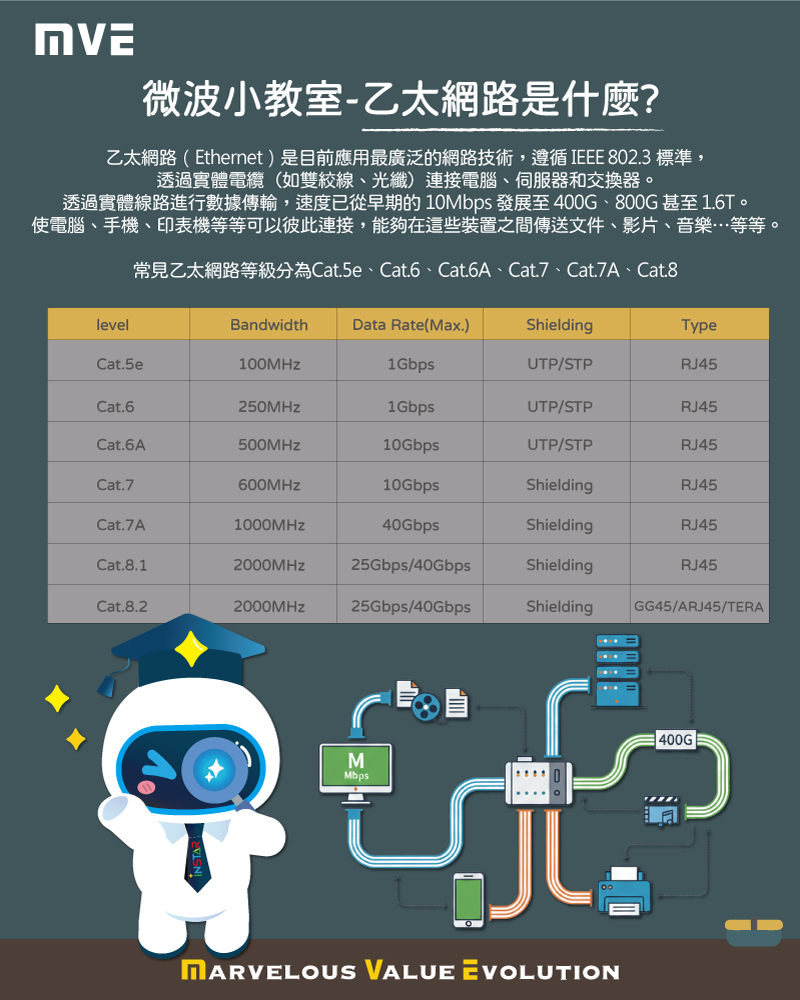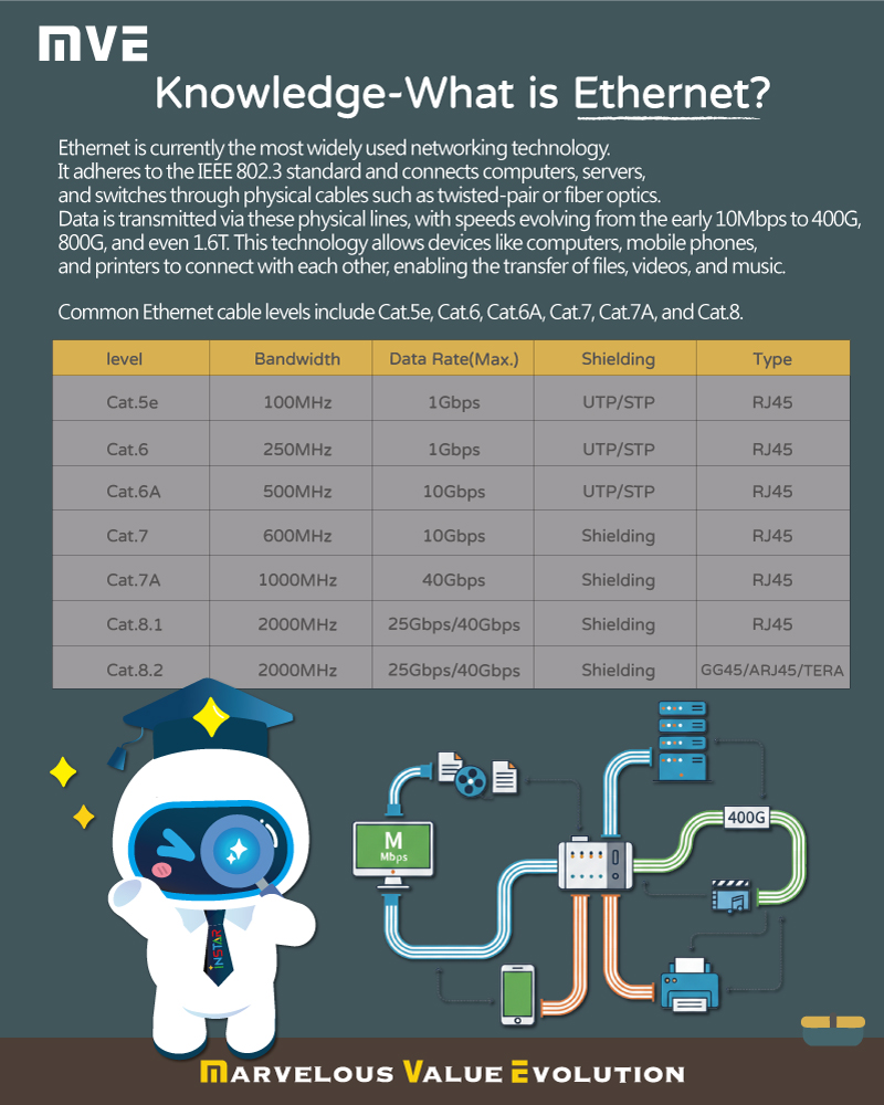 Common Ethernet cable levels include Cat.5e, Cat.6, Cat.6A, Cat.7, Cat.7A, and Cat.8.