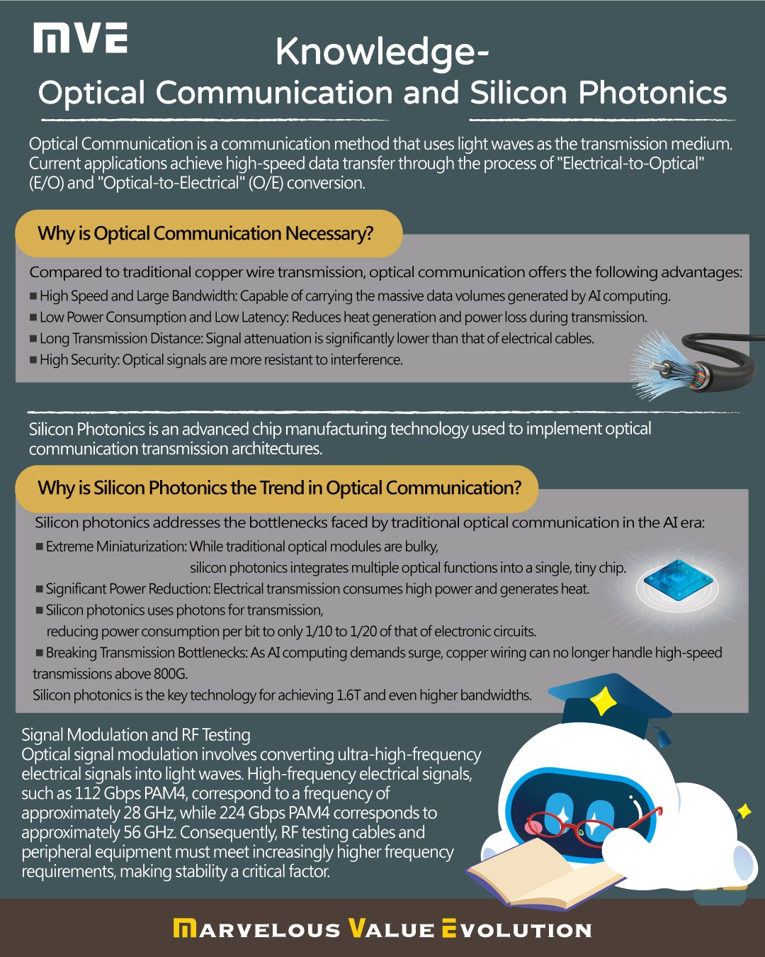 光訊號的調變是將超高頻的電訊號轉換為光波,高頻的電訊號,112 Gbps PAM4 對應頻率約 28 GHz224 Gbps PAM4 對應頻率約 56 GHz 。所以射頻測試線材及周邊設備須注意頻率需求越來越高,穩定性也相對重要。