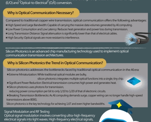 「光通訊」是以光波作為傳輸媒介的通訊方式,目前的應用是透過「電轉光」與「光轉電」的過程,實現資料的高速傳遞。